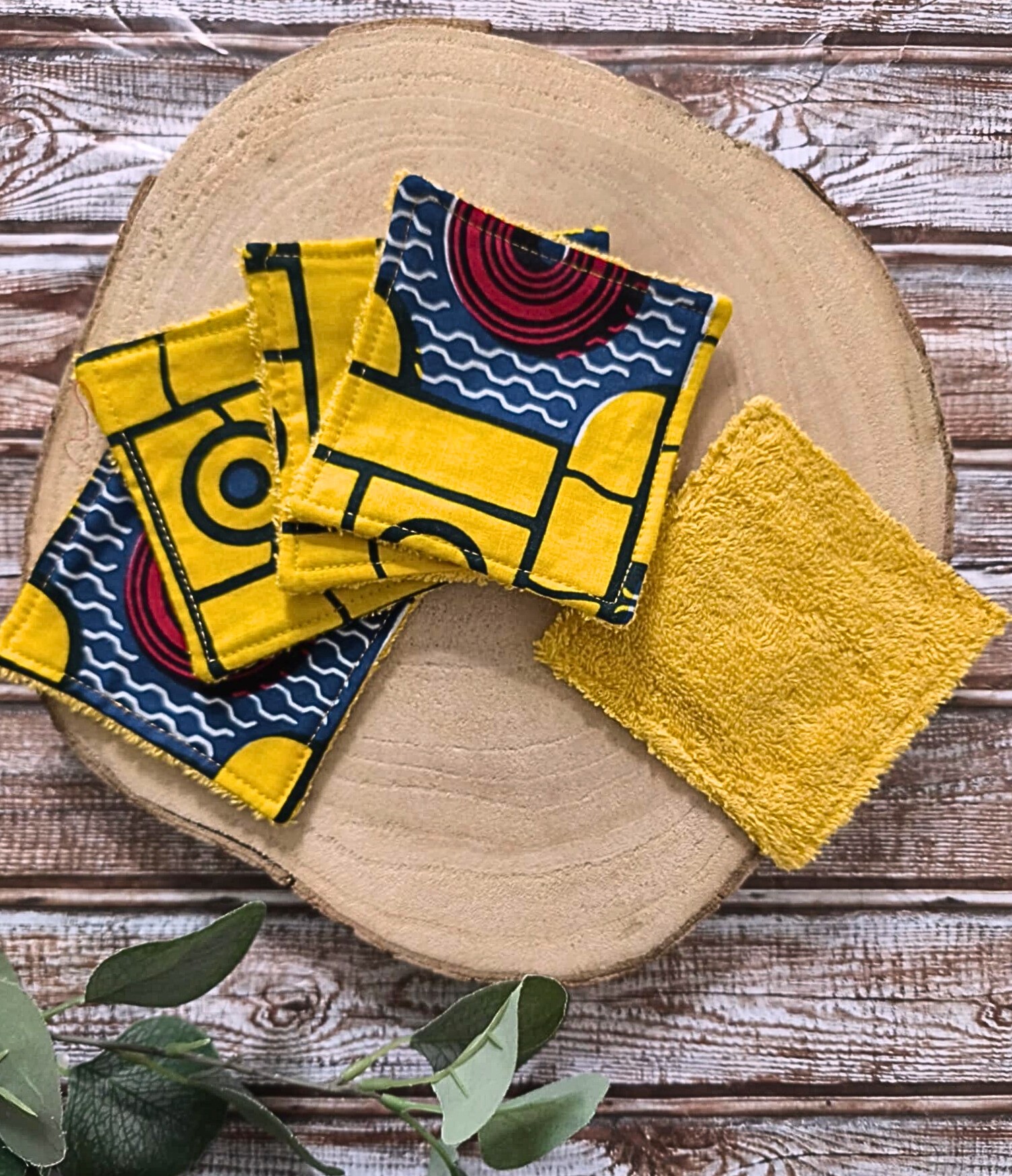 Lot de 5 lingettes lavables en wax jaune et éponge de coton jaune
