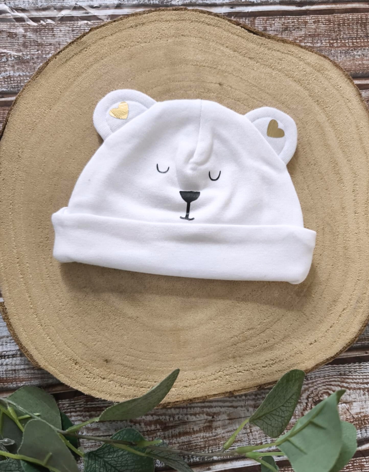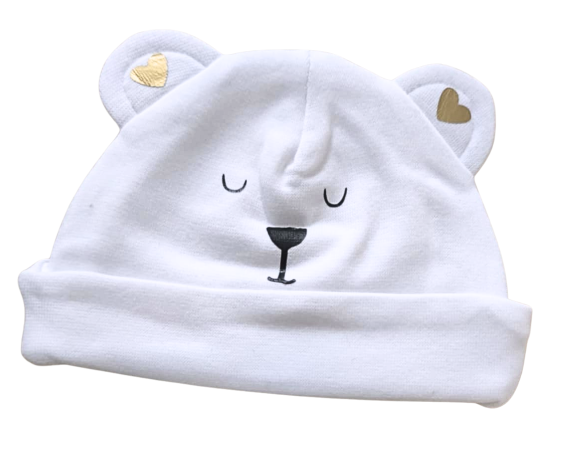 Bonnet de naissance pour bébé avec visage d’ourson et cœurs dorés, personnalisable au message de votre choix